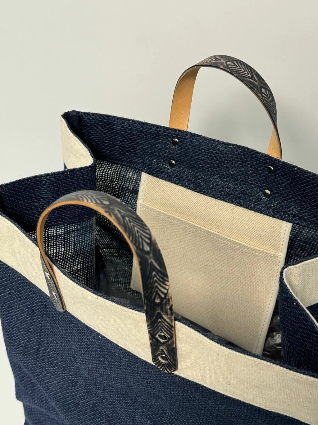 Tote playero Catalina: la compañera ideal para tus días de sol y relax. Esta cartera tipo tote está confeccionada en arpillera de alta calidad, combinada con manijas de cuero vaqueta natural curtido vegetal, lo que le otorga un toque de elegancia y durabilidad.